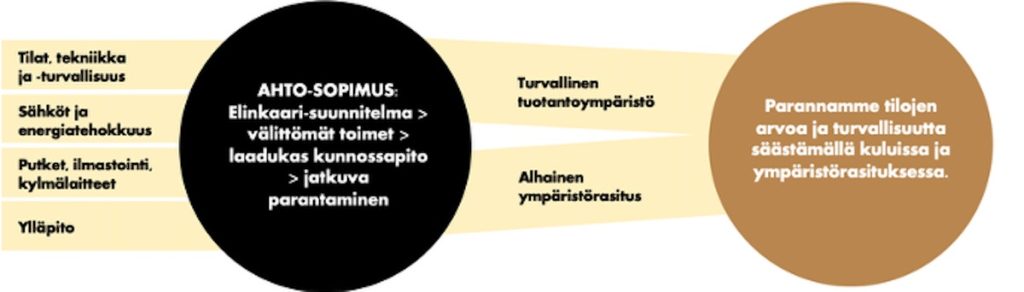 Ennakoimme, suunnittelemme, kunnostamme, ja huollamme kiinteistöjä, jotta niiden arvo säilyy ja tiloissa harjoitettu tuotanto on mahdollisimman turvallista ja energiatehokasta. Samalla varmistamme, että tuotanto voi jatkua jouhevasti ilman ylimääräisiä katkoksia.